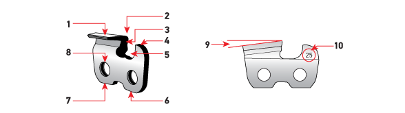 Antes de afilar la motosierra, necesita conocer el tipo de cadena y las especificaciones del ángulo de afilado. Puede encontrar esta información en el manual del propietario de la motosierra o en el paquete de la cadena. El código de identificación de la cadena generalmente está escrito en el eslabón motriz.