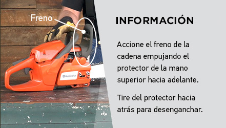 Active el freno de la cadena, luego sujete ligeramente la barra para motosierra en la prensa de banco. A continuación, libere el freno de la cadena para rotar la cadena a mano (asegúrese de usar guantes cuando realice esta acción).