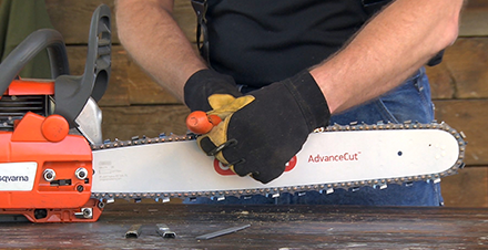 Si está afilando la cadena mientras se encuentra fijada en la barra de la motosierra, primero asegúrese de que esté correctamente tensada.